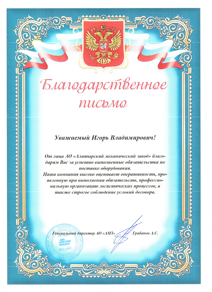 Благодарность за успешно выполненные обязательства по поставке оборудования